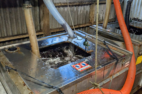 船で運ばれてきた海苔が、ほとんど時間を置かずに加工工程へ入っていく。