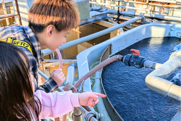 タンクの中を覗き込む子どもたち。